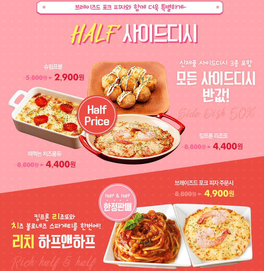 내    용: 브레이즈드 포크 피자 주문 시, 모든 사이드디시 반값