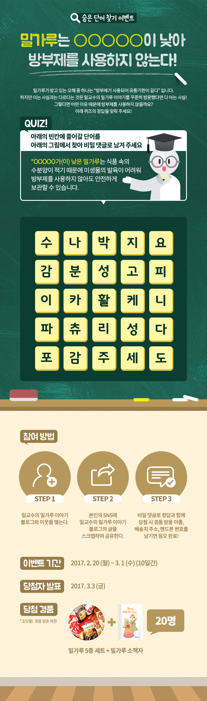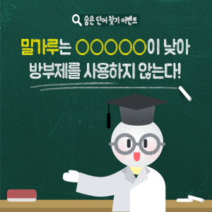 밀가루가 받고 있는 오해 중 하나는 "방부제가 사용되어 유통기한이 길다" 입니다. 하지만 이는 사실과 다르다는 것은 밀교수의 밀가루 이야기를 꾸준히 방문했다면 다 아는 사실! 그렇다면 어떤 이유 때문에 방부제를 사용하지 않을까요? 아래 퀴즈를 보고 숨은 단어의 정답을 맞춰 보세요!!